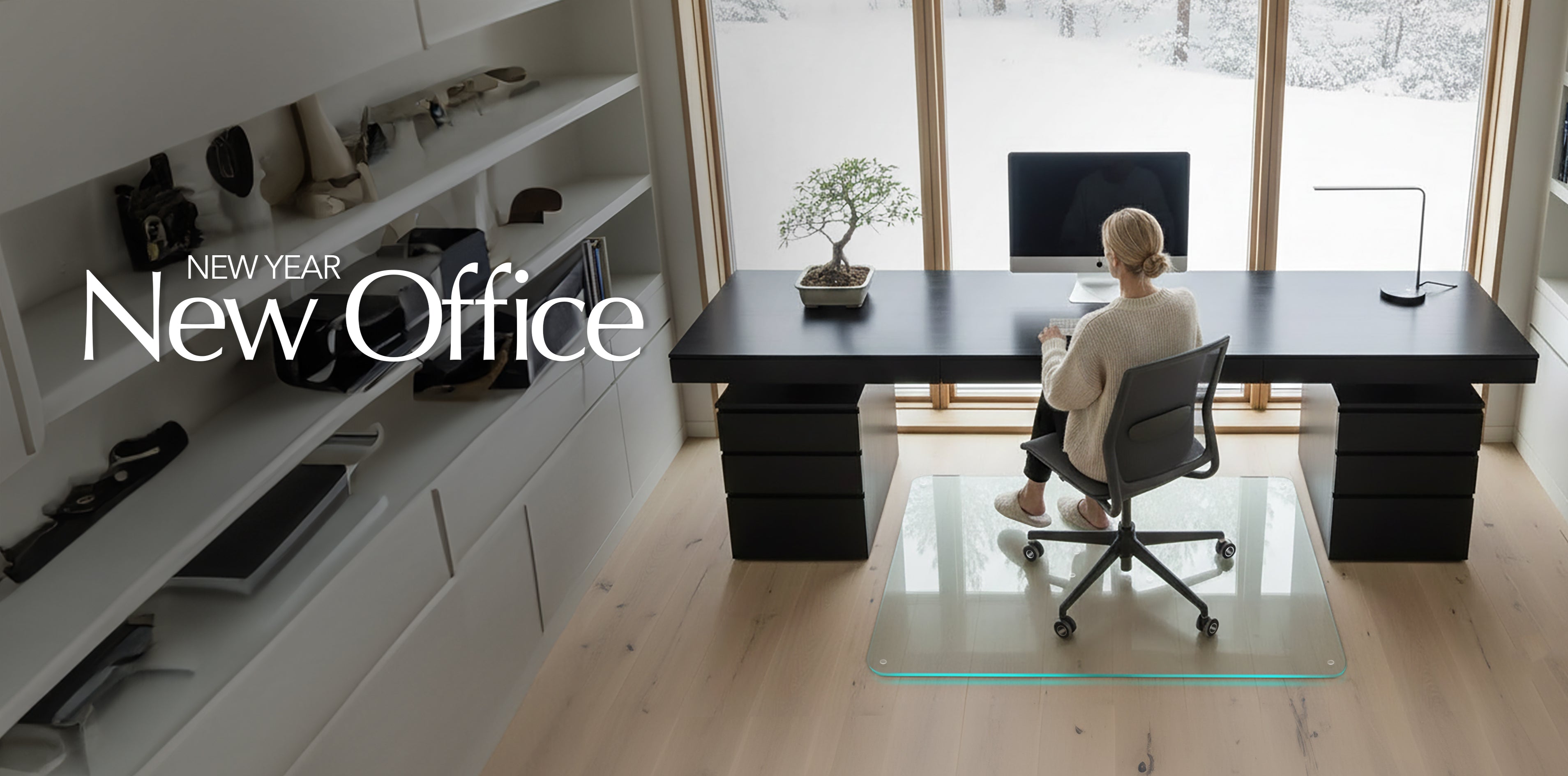 Modern office setup with a cityscape view through large windows. A black desk, computer, and office supplies. An ergonomic chair on a custom shaped Glass Chair Mat sits on a dark carpet.